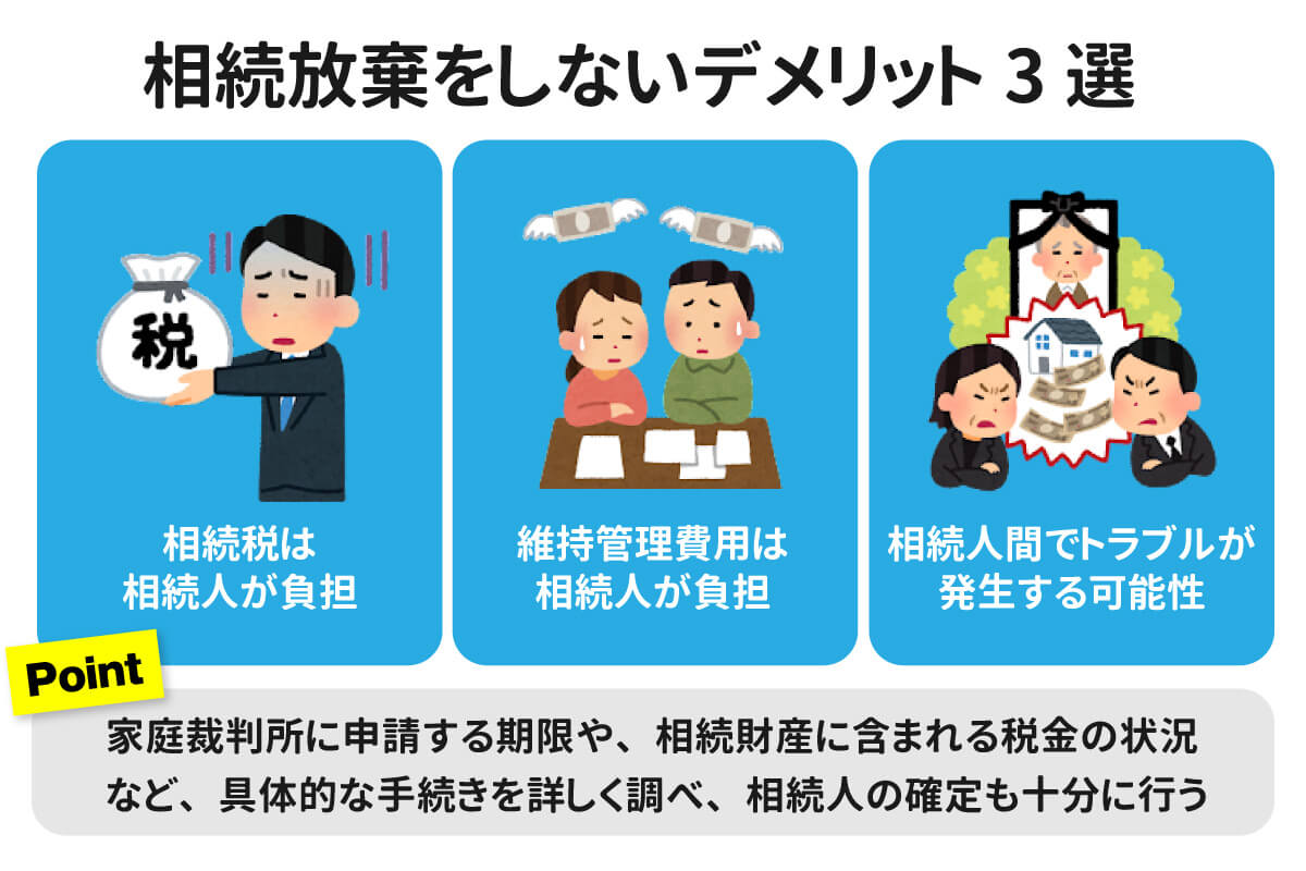 こちらのパートでは、自宅の相続放棄をしなかった場合、相続税の負担や維持管理費用の発生、複数の相続人でのトラブルなどが発生してしまう場合もありますので、ここでは相続放棄におけるデメリットの理由について解説していきます。