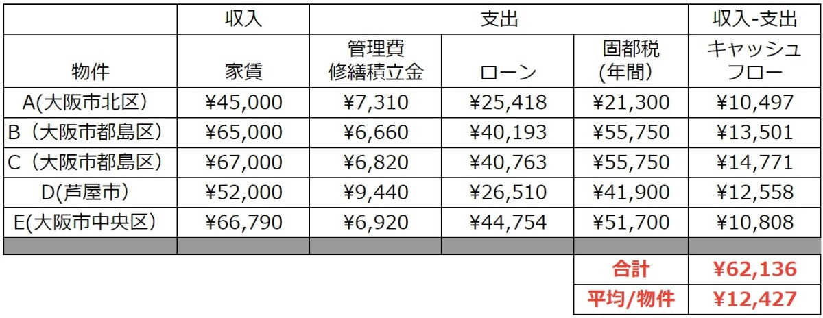 早速ですが、所有している区分マンション5物件の収支状況はこちらです。1物件1カ月あたり平均12,427円(キャッシュフロー)を稼いでいます。