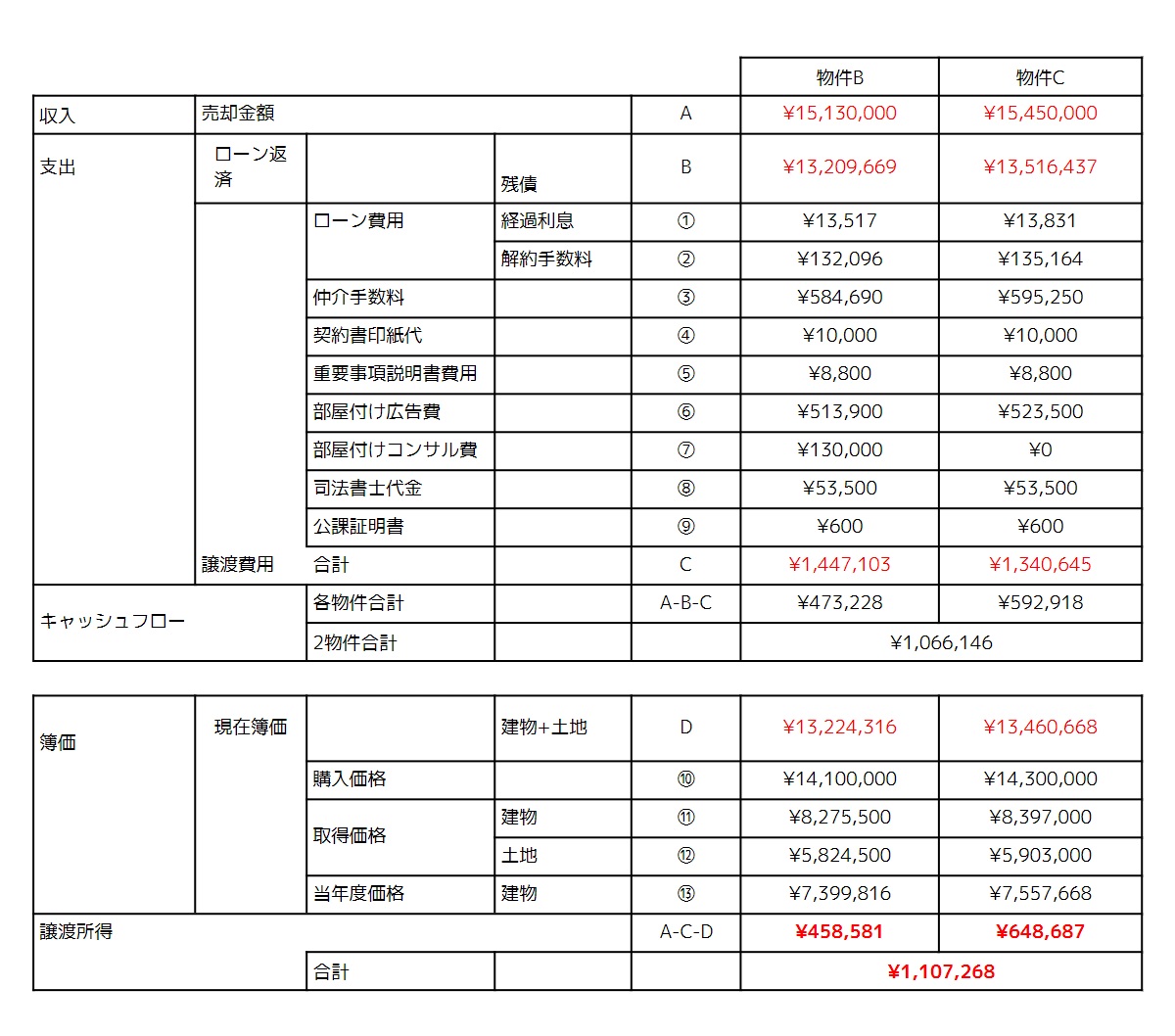 それでは実際に2つの物件の『売却時』収支詳細は下記になります。