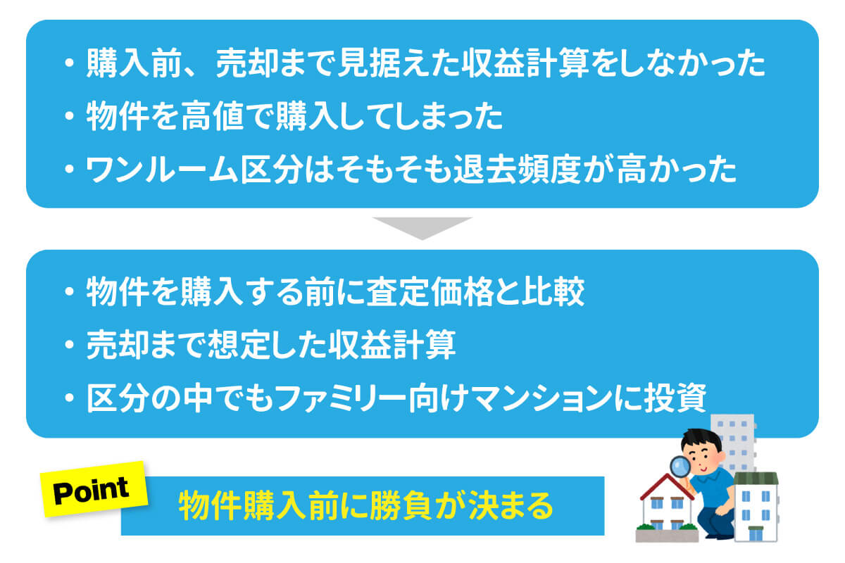 上記をまとめると、最初に売却までを想定した収益計算をしなかったこと、加えて物件の売値と査定価格のギャップもチェックしなかったことで、物件を購入した瞬間にすでに失敗していたという事。またワンルーム物件だったことで、賃貸経営中も退去頻度が多く、空室と原状回復費用などで稼げなかった、という事です。