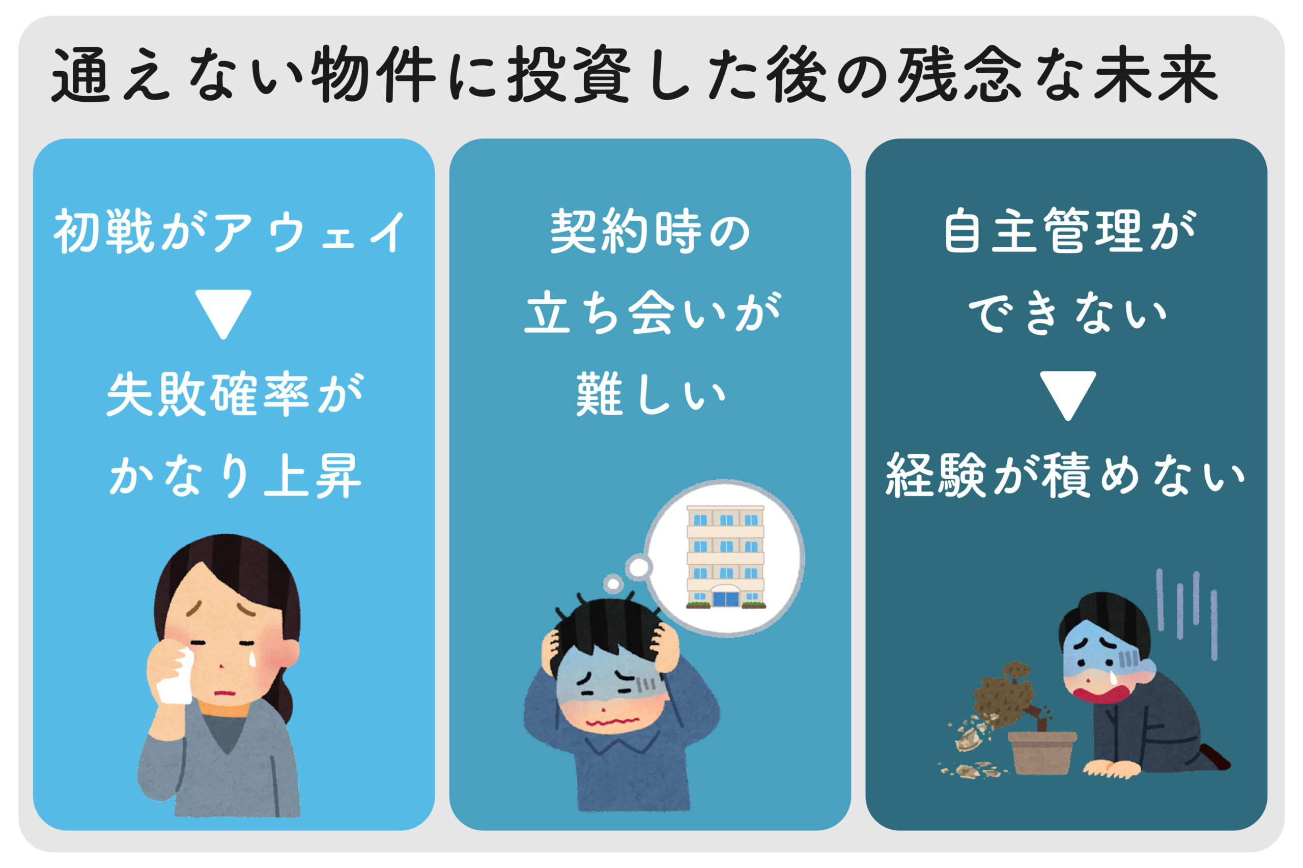 上記をまとめると、初心者サラリーマンが通えない物件への不動産投資をすると、「稼げない、手間が掛かる、成長できない」ということになります。