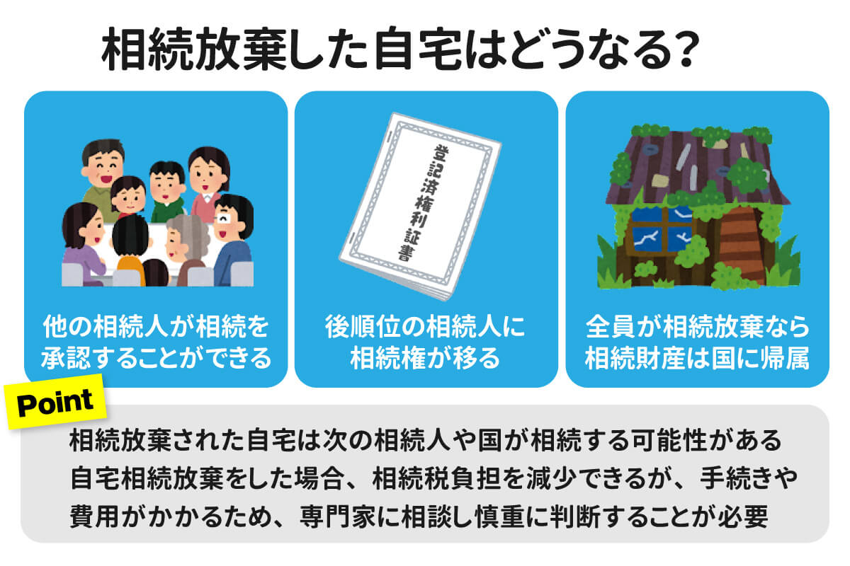 自宅相続放棄をした場合、相続税負担を減少でき、その自宅は他の相続人が相続することになります。相続放棄には手続きや費用がかかるため、自宅相続放棄をする場合は、専門家に相談し慎重に判断することが必要です。