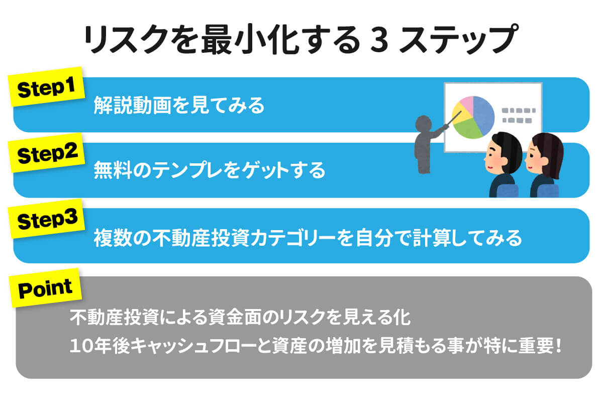 こちらのパートでは、不動産投資プランでリスクを最小化する方法を具体的に解説していきます。最後に無料テンプレをご案内しますので、ぜひご確認下さい。