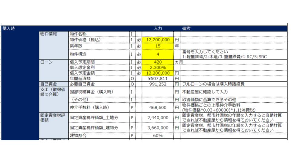 黄色いセルが入力する箇所になります。毎度思いますが、結構簡単です。でも実際にここまで計算しない人が後を絶ちません。自分で計算しないとかなり高い確率で業者にカモにされます…「一人で入力するのが不安だな」という場合は無料相談もやっていますので悩まず相談してください。