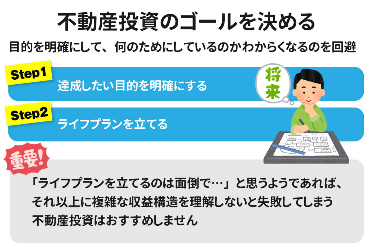重要なことは、不動産投資においてライフプランを立てることは必須だと自覚することです。逆に「ライフプランを立てるのは面倒で…」と思うようであれば、不動産投資はおすすめしません。それ以上に複雑な収益構造を理解しないと確実に失敗します。本気で不動産投資を始めたいかの試金石とお考え下さい。