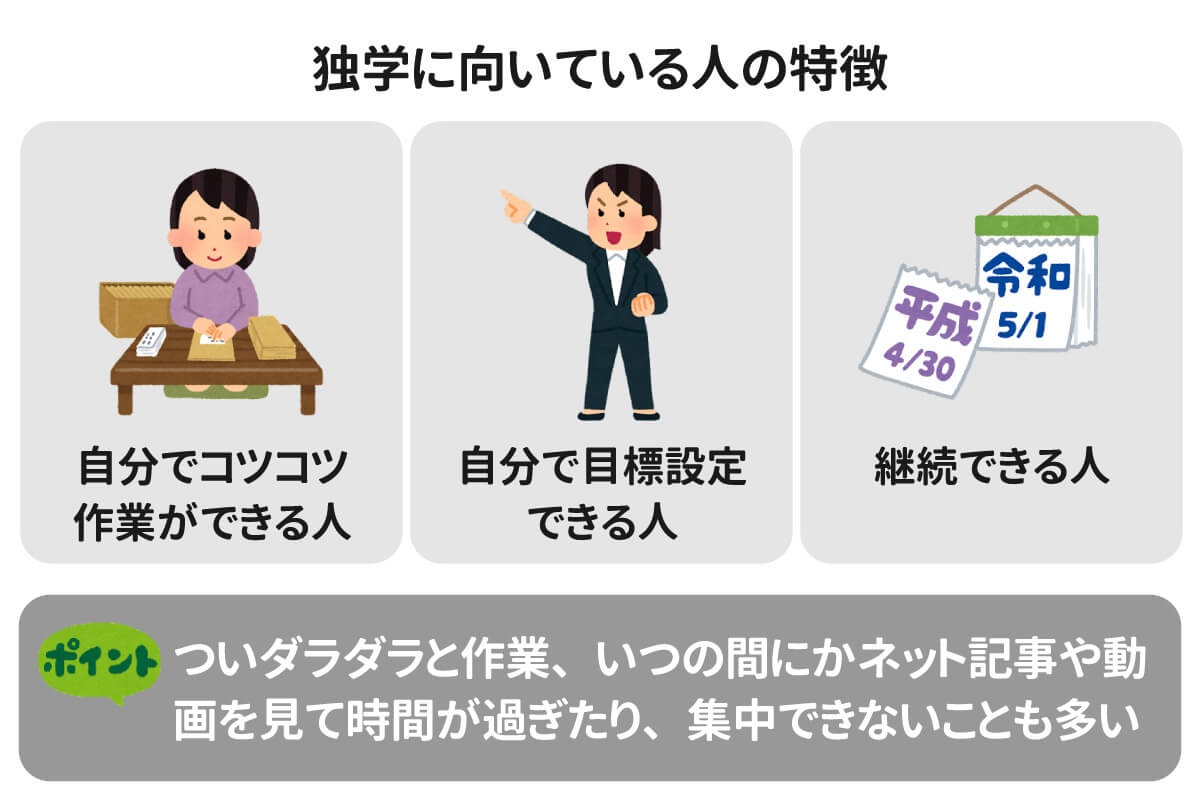 独学は自分のペースで作業ができますが、それがかえってデメリットになる場合もあります。ついダラダラと作業してしまったり、いつの間にかネット記事や動画を見ていて時間が過ぎたりなど、集中できないことも多いですよね。