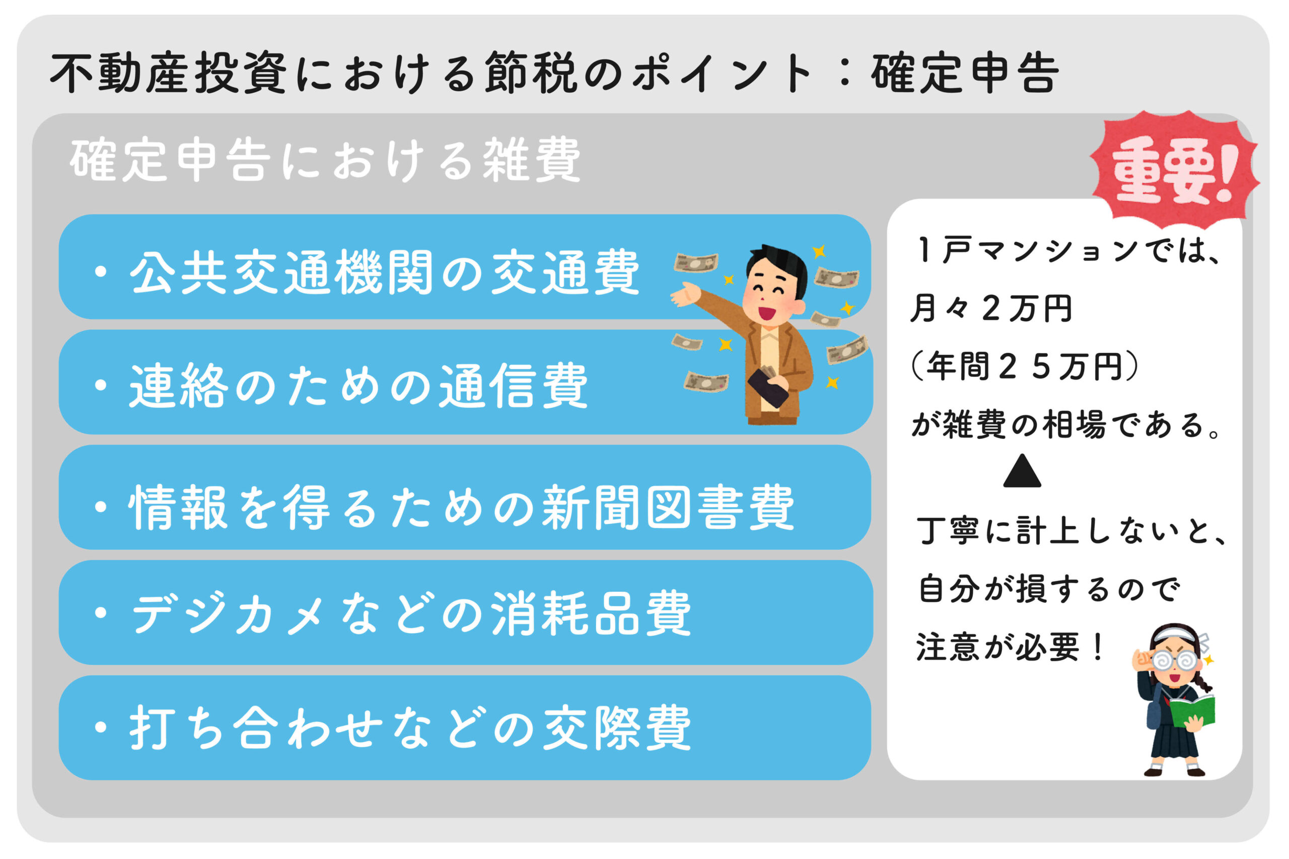 雑費をあまり多く計上しすぎると税務署から疑われる可能性も高くなるでしょう。しかし、雑に計上してしまうと自分が損をしてしまいます。不動産投資のために使った必要経費は必ず丁寧に計上するようにしましょう。